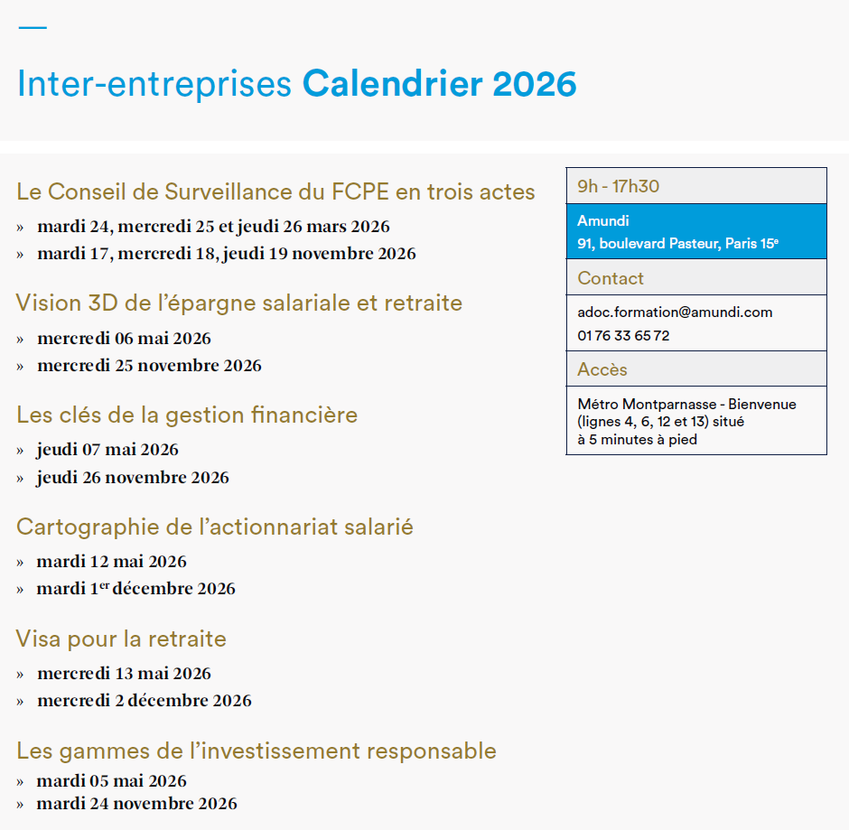 Prenez contact avec votre interlocuteur habituel chez Amundi Epargne Salariale et Retraite ou avec l’équipe Formation : adoc.formation@amundi.com - 01 76 33 65 72