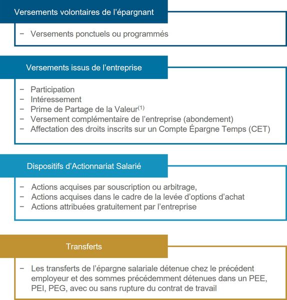 Selon les dispositifs mis en place dans l’Entreprise, le PEE peut être alimenté par :